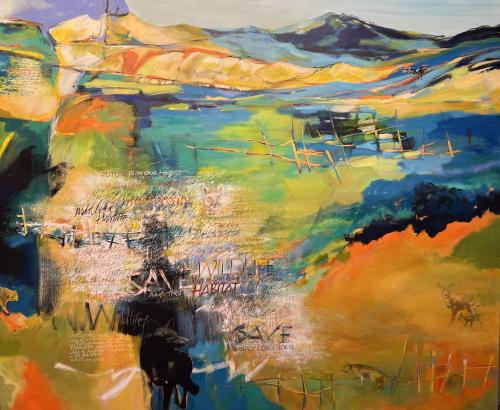 Explorative usage of watercolor, acrylic paint on paper, canvas, recycled cloth, and mixed media. combined with Imaginative design elements, contribute to the artist's style, which reveals simplified and abstracted shapes played against areas of more representational imagery. Her paintings and textile works are a personal statement about wildlife and wild places in Oregon and in The Northern Great Basin.